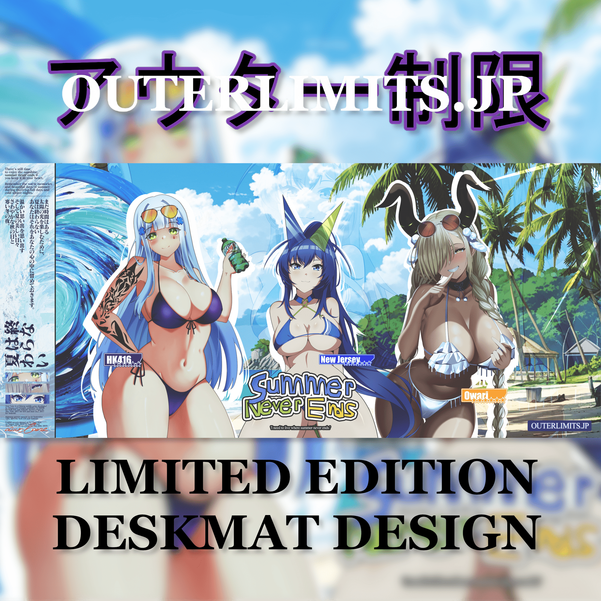 The limited edition Summer Never Ends deskmat, featuring HK416, New Jersey, and Owari having a fun day together at the beach! The deskmat measures 900x400x4mm!